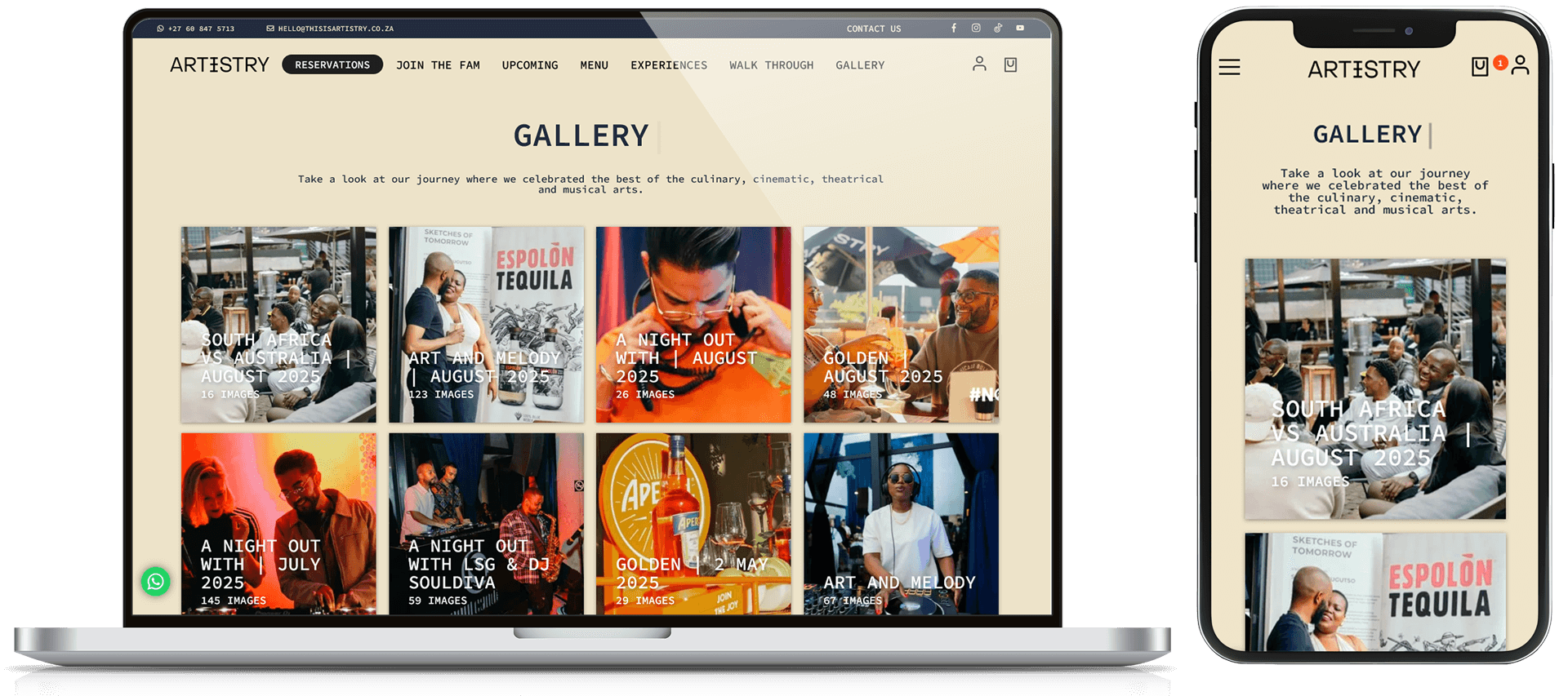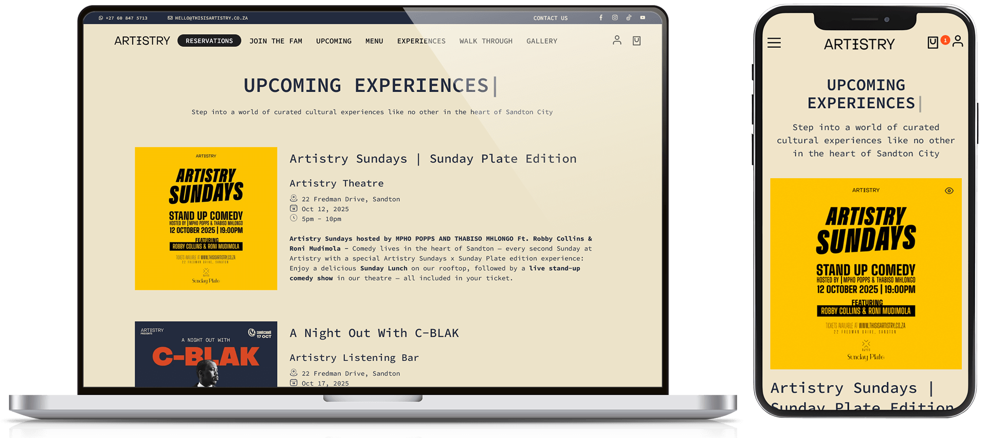 We built a secure, custom ticketing engine integrated into the site. It handles seating selection, ticket categories (general, VIP, etc.), and inventory management so Artistry can offer events, theatre shows, and special nights seamlessly.