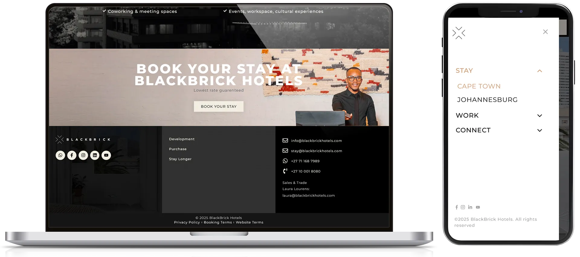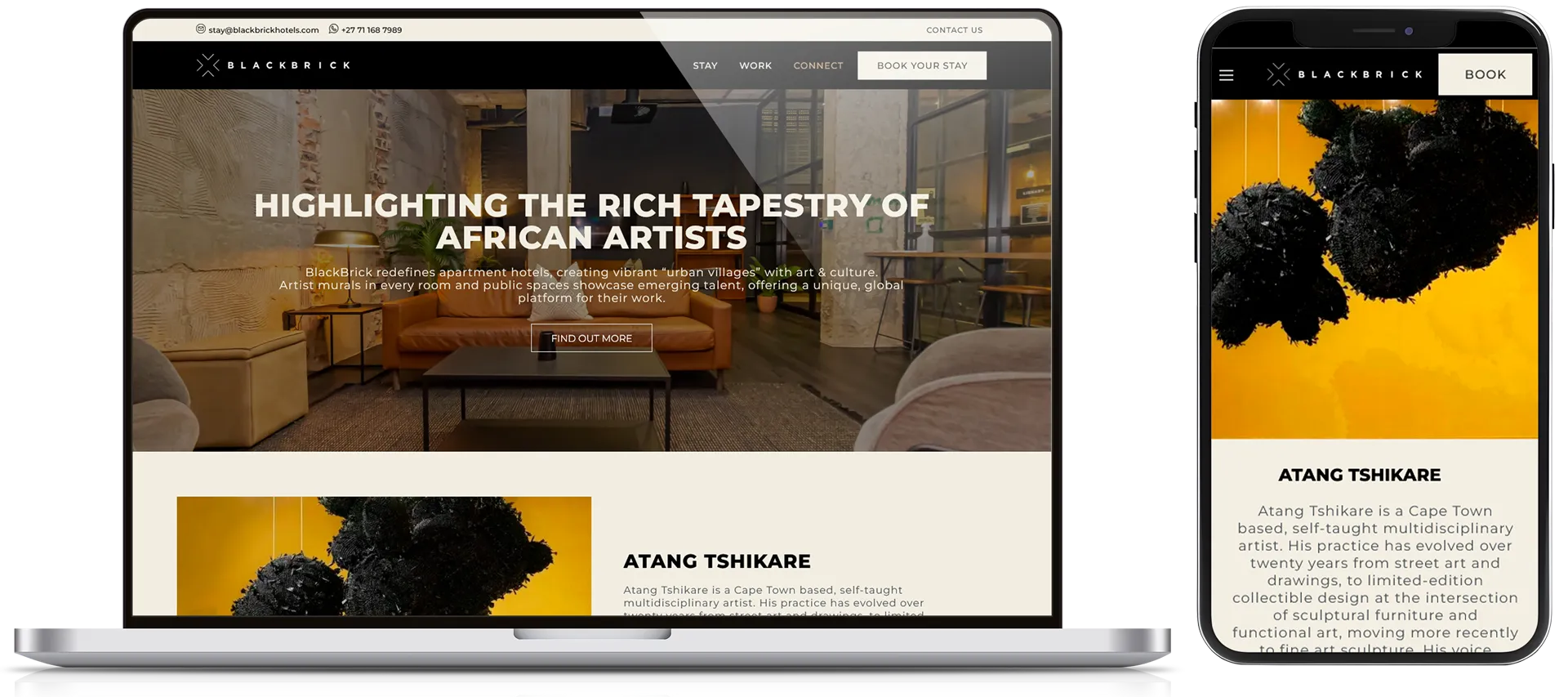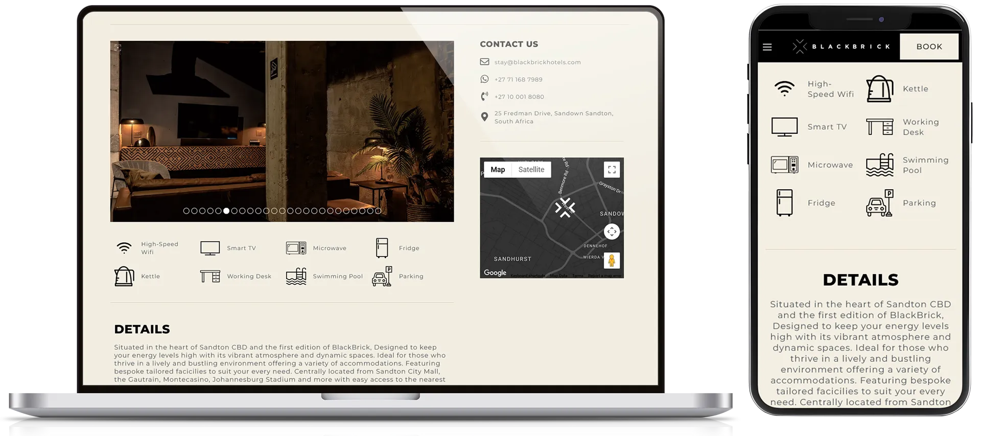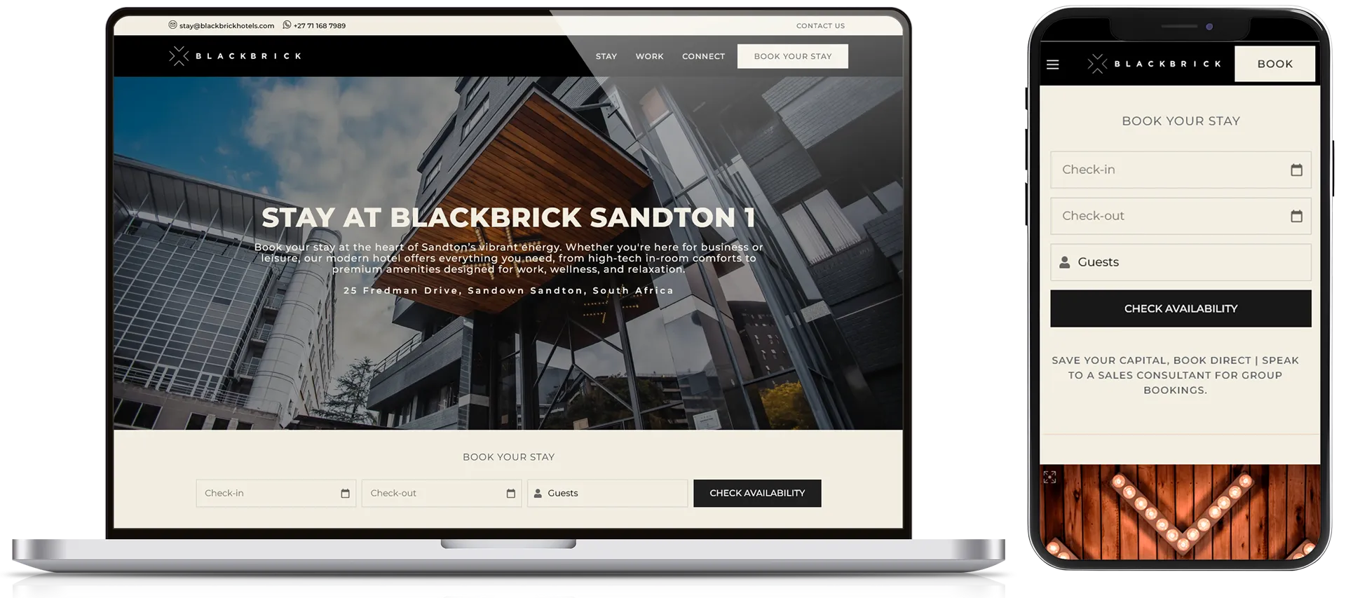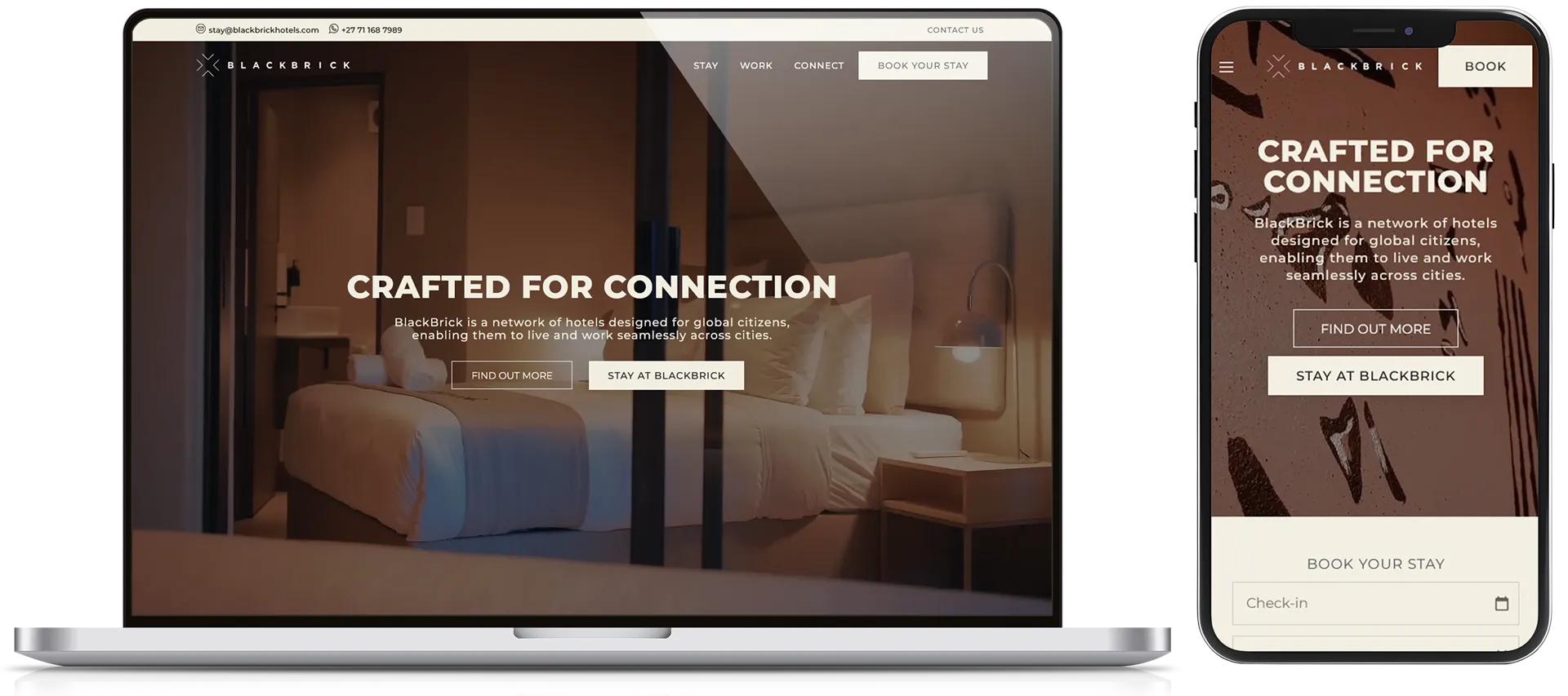 BlackBrick is a network of aparthotels and hospitality properties focused on blending the convenience of long-term stays with hotel-level services, designed for global citizens who live and work across cities. With multiple properties in prime urban areas such as Sandton and Cape Town, BlackBrick needed a digital presence that exemplifies sophistication, supports direct booking, and scales as their portfolio grows.